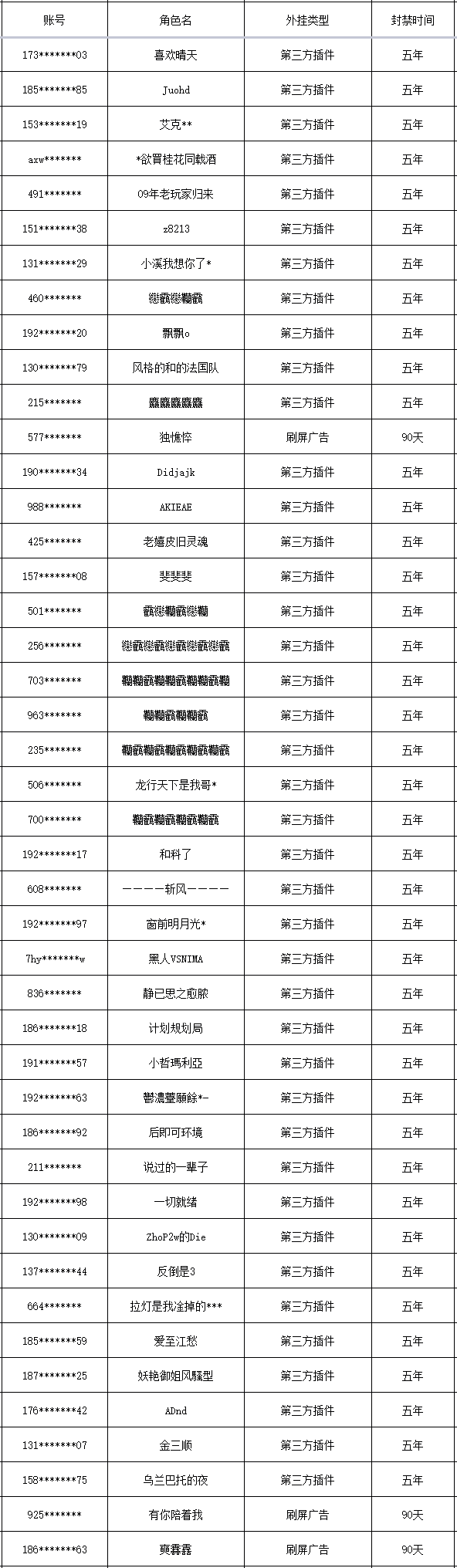以下是本次封禁的游戏账号名单: