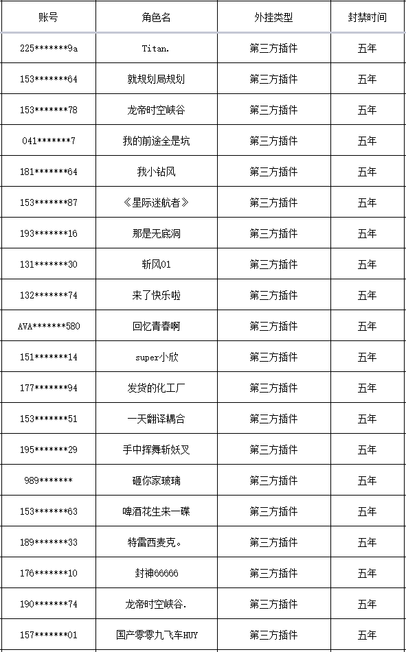 以下是本次封禁的游戏账号名单: