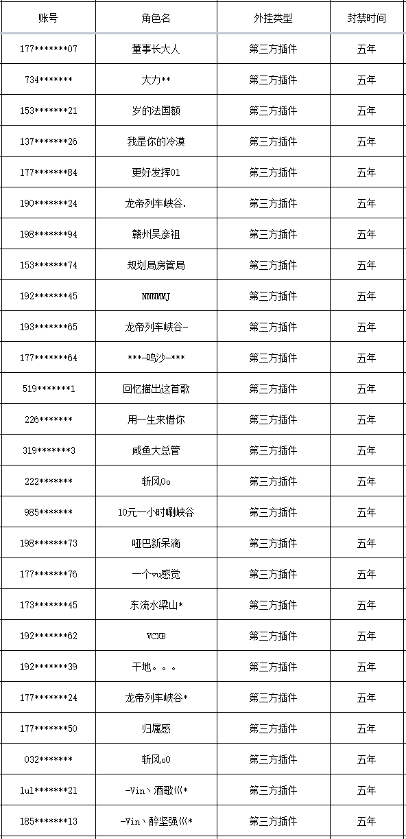 以下是本次封禁的游戏账号名单: