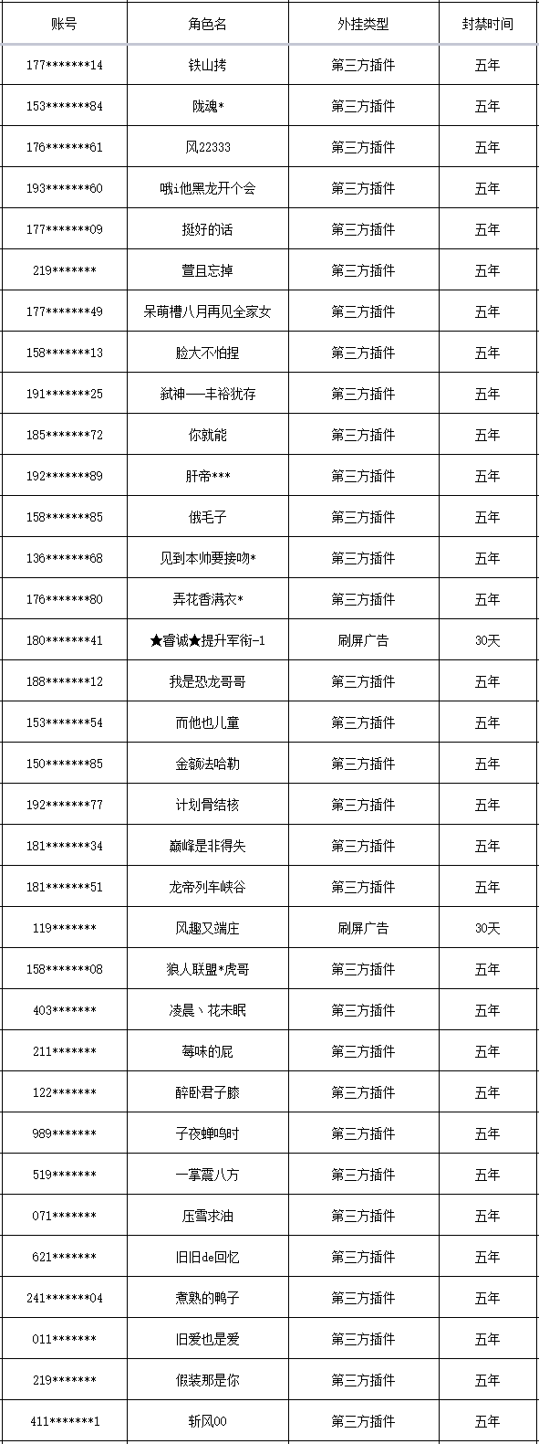 以下是本次封禁的游戏账号名单: