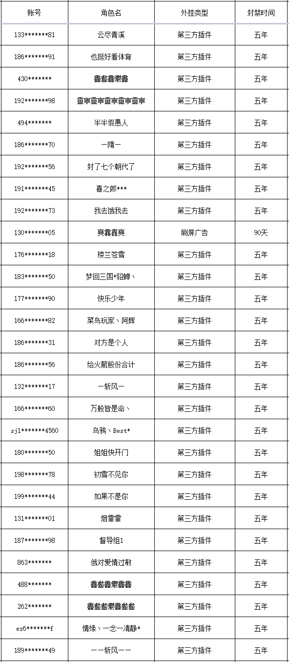 以下是本次封禁的游戏账号名单: