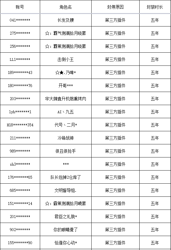 以下是本次封禁的游戏账号名单: