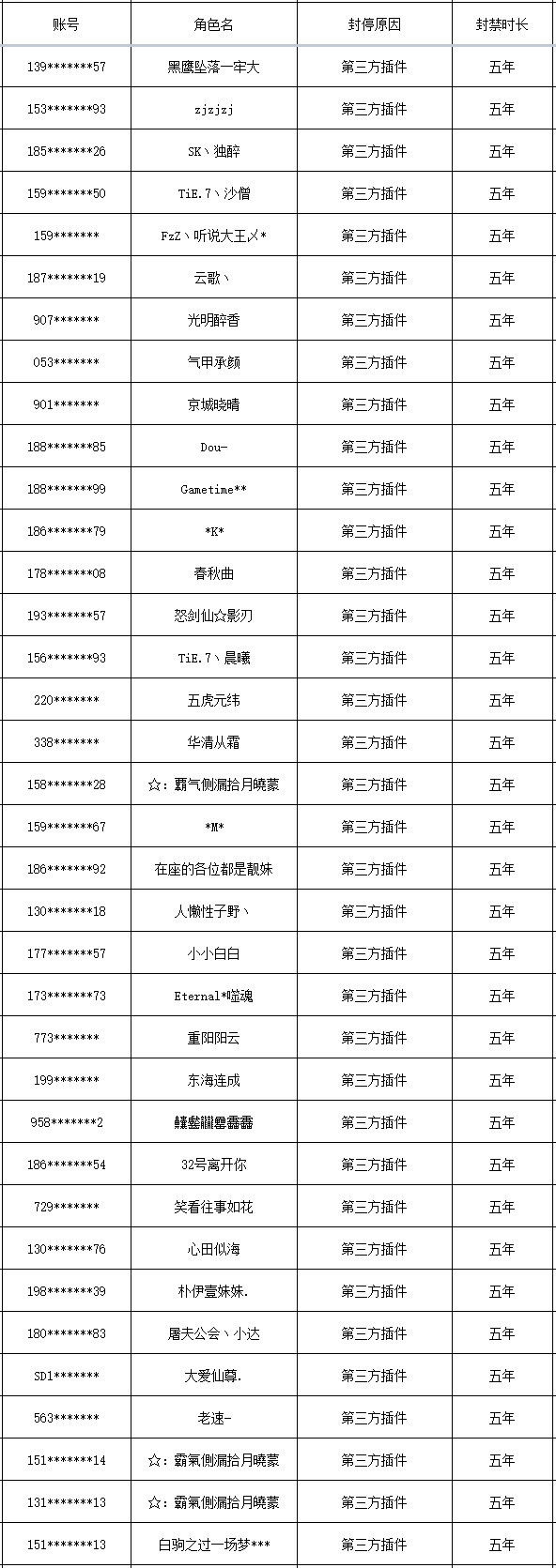 以下是本次封禁的游戏账号名单: