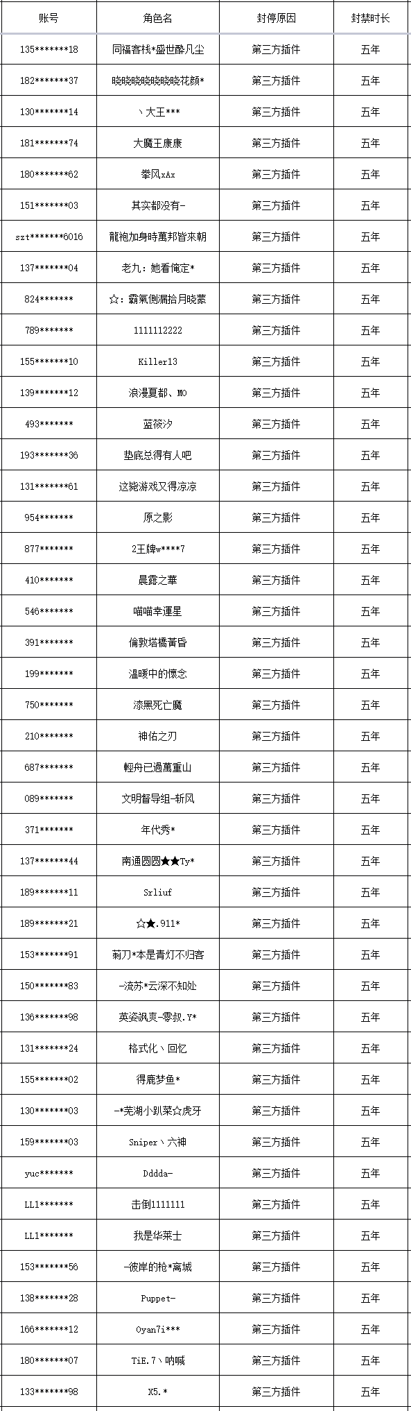 以下是本次封禁的游戏账号名单: