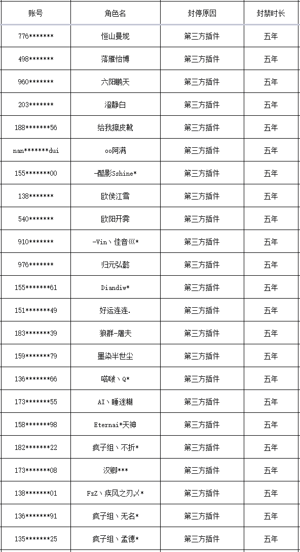 以下是本次封禁的游戏账号名单: