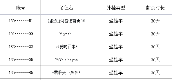 以下是本次封禁的游戏账号名单: