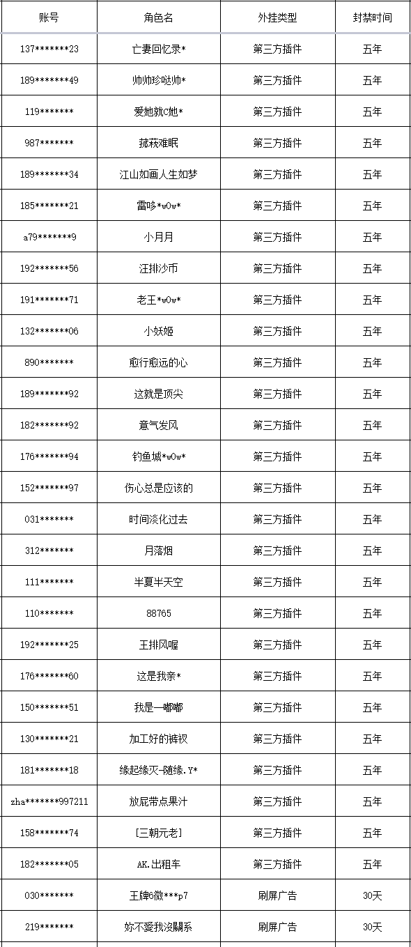 以下是本次封禁的游戏账号名单: