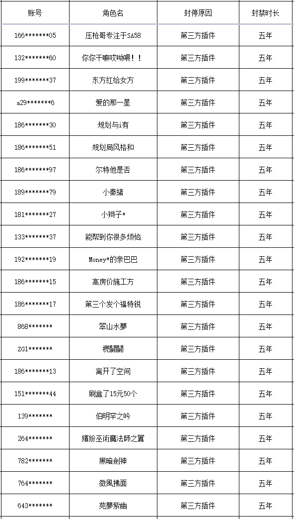 以下是本次封禁的游戏账号名单: