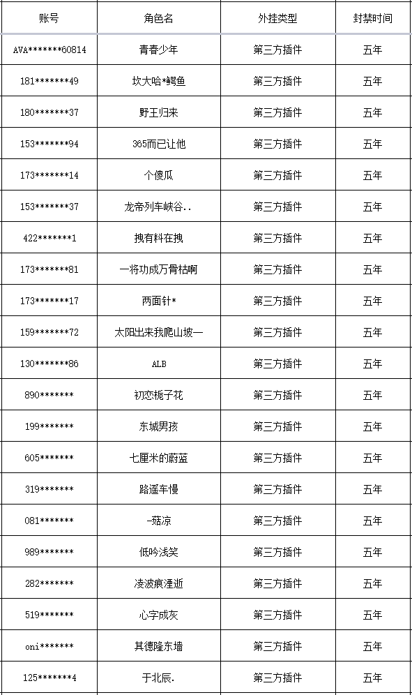 以下是本次封禁的游戏账号名单: