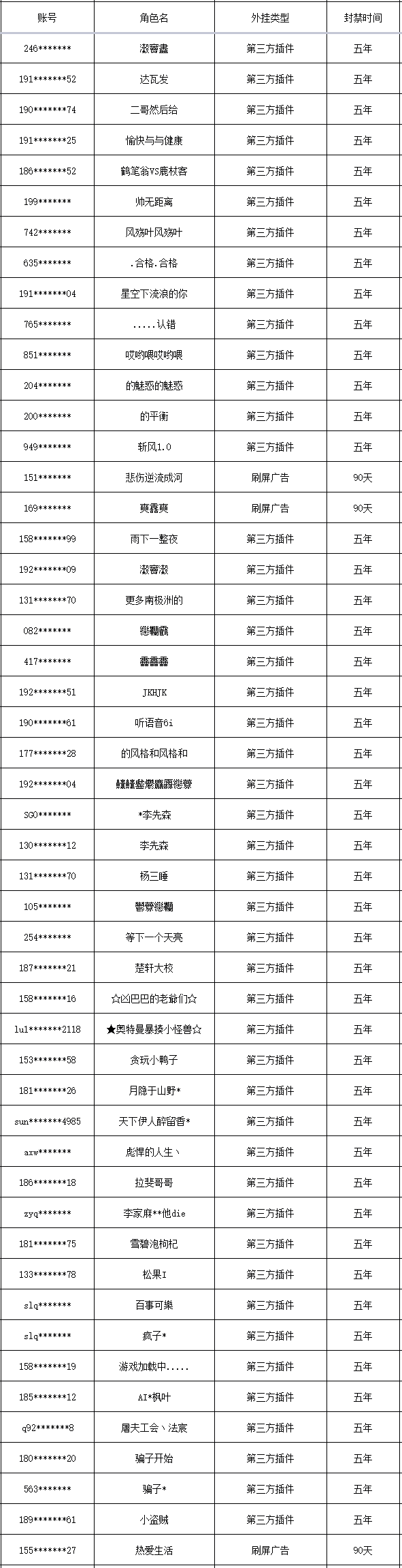 以下是本次封禁的游戏账号名单: