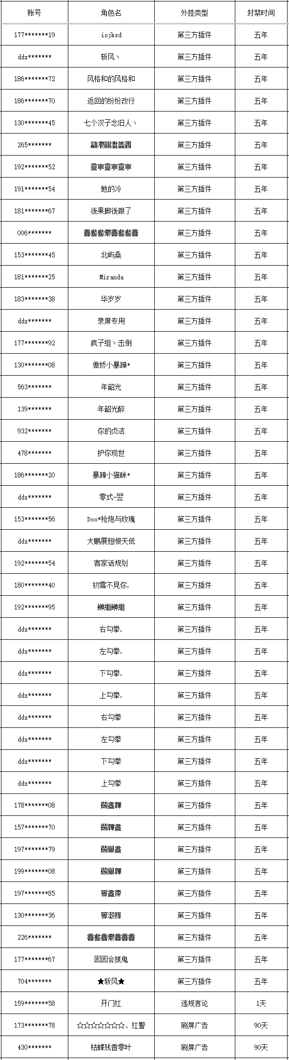 以下是本次封禁的游戏账号名单: