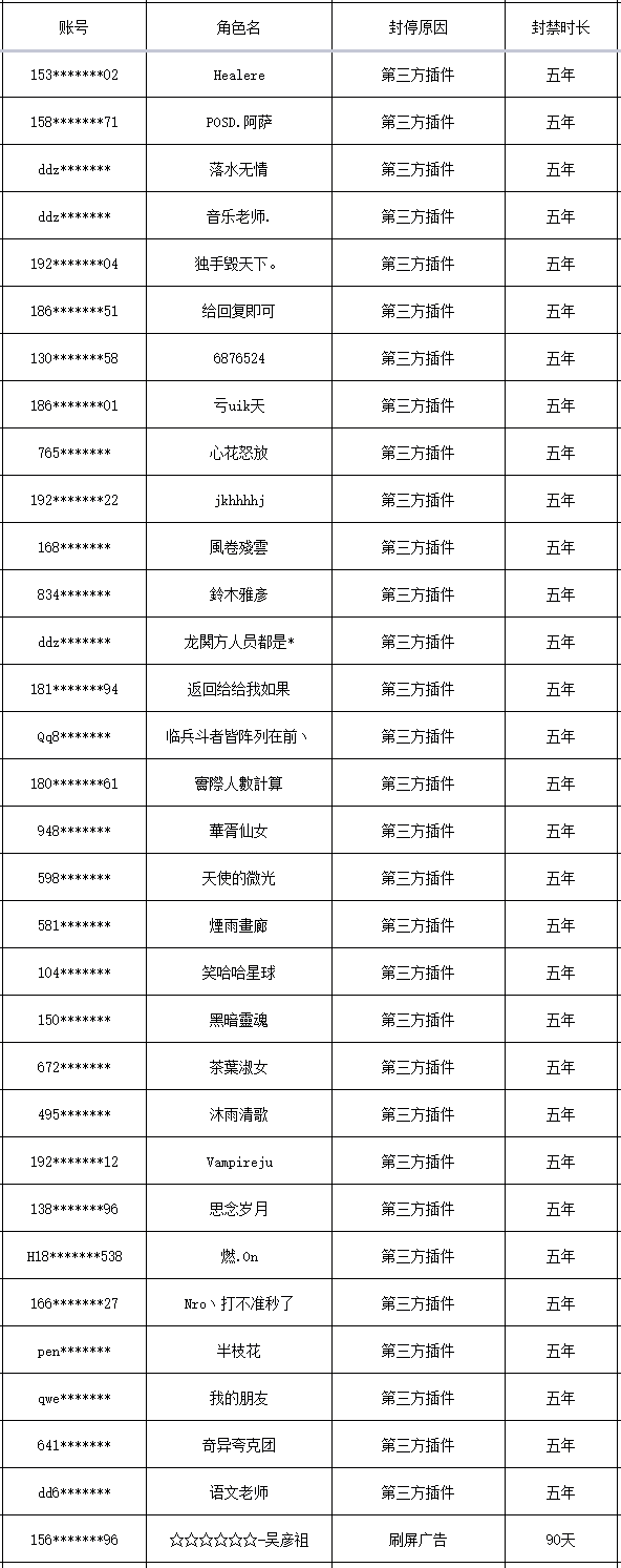 以下是本次封禁的游戏账号名单: